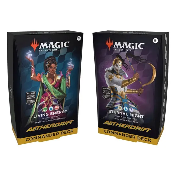 Witaj w świecie Aetherdrift – najbardziej ryzykownym i widowiskowym wyścigu w dziejach Multiwersum! Te dwie gotowe do gry, 100-kartowe talie Commander to idealny sposób na wejście w najnowszą mechanikę gry. Wybierz swoją maszynę, zgromadź paliwo i zostaw przeciwników w tumanach pyłu.
